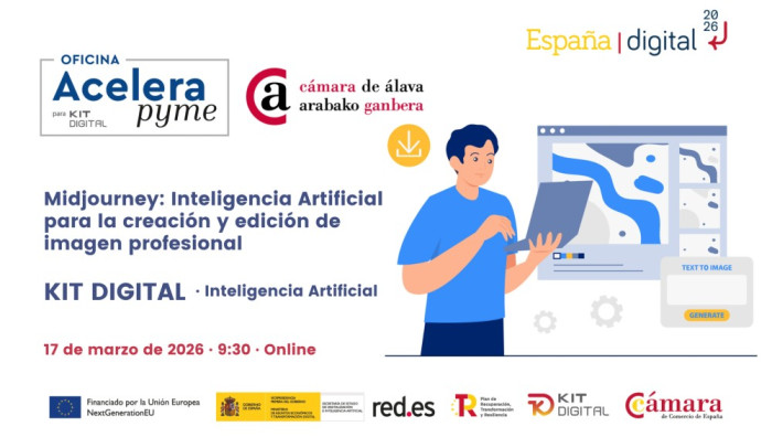 La Oficina Acelera Pyme de la Cámara de Álava te invita a este webinar "Midjourney: Inteligencia Artificial para la creación y edición de imagen profesional" que tendrá lugar el próximo 17 de marzo de 2026 a las 9:30h en formato online.