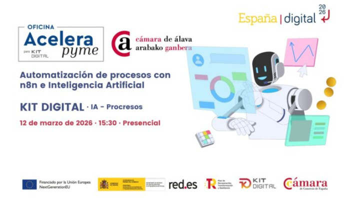 La Oficina Acelera Pyme de la Cámara de Álava te invita a esta jornada presencial gratuita «Automatización de procesos con n8n e Inteligencia Artificial: taller práctico.» que tendrá lugar el próximo 12 de marzo de 2026 a las 15:30h en formato presencial.
